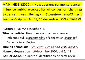 . Selon les formats bibliographiques utilisés, la mention du périodique peut être précédée de « in : ».Si la référence est complète, on trouvera également la date ainsi que le numéro ou le volume du périodique dans lequel est paru l'article, ainsi que sa pagination.