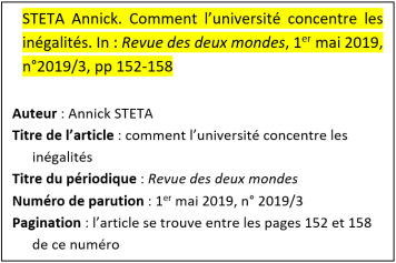 Dans vos bibliographies, figurent certainement des références d'articles de périodiques. Comment les reconnaissez-vous ? Voici les éléments d'identification :