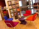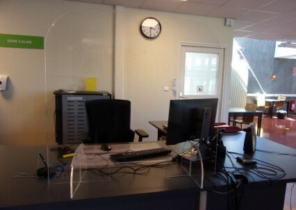 Tout est prévu pour que vous puissiez travailler dans de bonnes conditions, un cadre lumineux et des espaces adaptés : en rez-de-chaussée, une zone silence pour se concentrer et mémoriser, à l’étage la possibilité de chuchoter et d’échanger pour s’entraider. Des salles de travail, 4 en tout, constituent des espaces de communication : on peut donc y parler à voix haute pour avancer sur des travaux dirigés, mais il faut les réserver car elles sont souvent occupées. Des ilots de détente sont disséminées dans la bibliothèque, reconnaissables aux fauteuils de couleur vive, invitation à une pause bien méritée en lisant, pourquoi pas, un magazine d’actualité ou une BD mise à disposition.