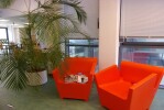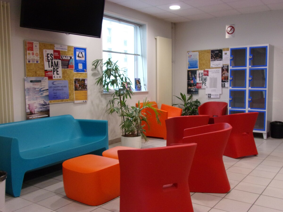 Le hall d’accueil offre la possibilité de se détendre en prenant un café au distributeur, de discuter installés dans des fauteuils ou de profiter d’une salle où l’on peut manger, travailler et même ne rien faire !